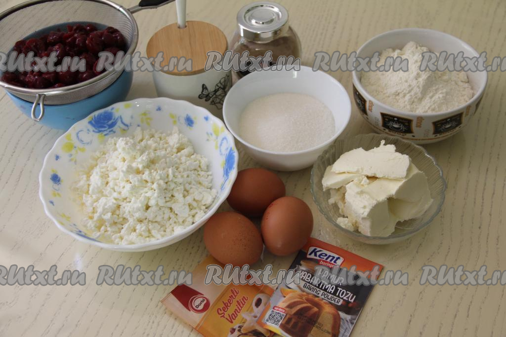 Подготовить продукты. Творог можно взять любой жирности и консистенции. Сливочное масло нужно заранее достать из холодильника, чтобы оно стало мягким при комнатной температуре. Свежую вишню вымыть, удалить косточки, откинуть на дуршлаг, чтобы стекла лишняя жидкость. Если вы будете печь кекс с замороженной вишней, тогда ягоды нужно разморозить и откинуть на дуршлаг, чтобы стекла лишняя жидкость.