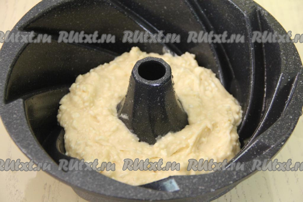 Всыпать половину просеянной муки и разрыхлитель, перемешать тесто для кекса.