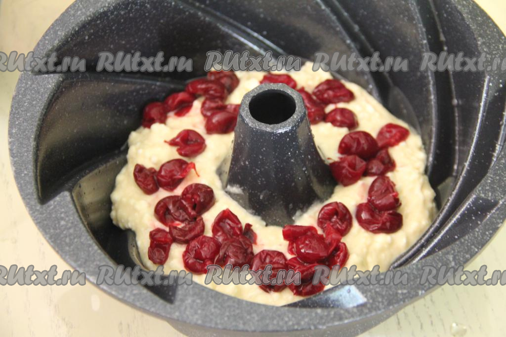 Поверх теста в хаотичном порядке выложить часть вишни.