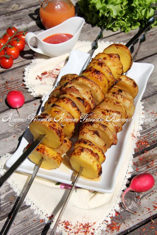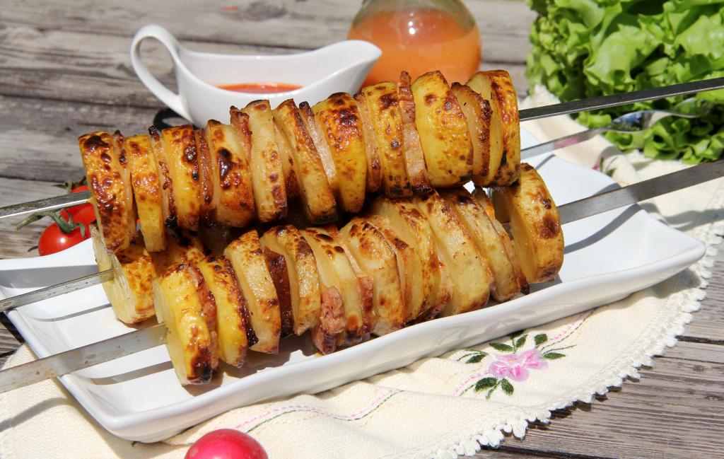 Предлагаю пожарить на мангале аппетитный, сытный шашлык из картошки с салом на шампурах. Рецепт несложный и очень удачный. Сало в процессе приготовления шашлыка пропитывает картофель, поэтому картошечка покрывается аппетитнейшей корочкой и получается очень вкусной.