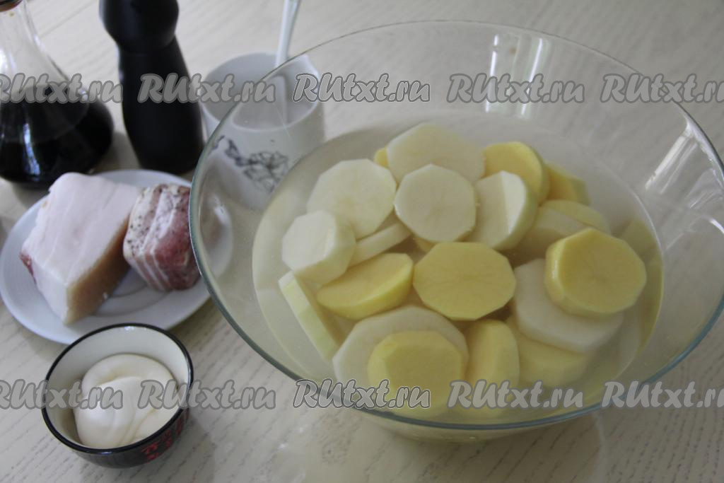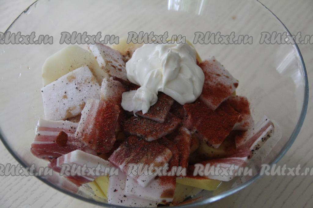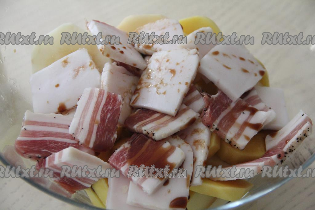 В миске соединить ломтики сала и картошку.