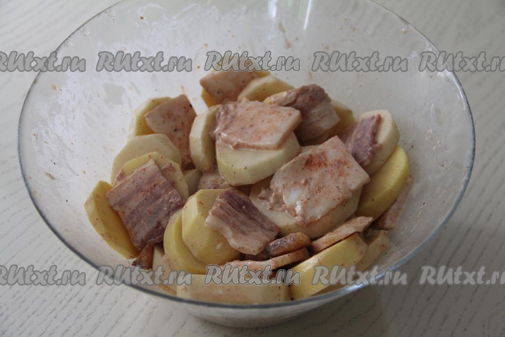 Перемешать картошку со специями, соевым соусом, майонезом и салом. Оставить мариноваться минимум на 1 час.