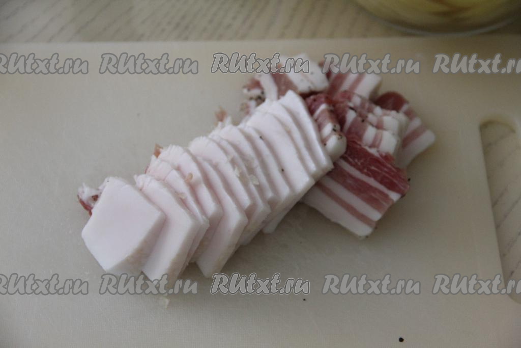 Сало нарезать на ломтики толщиной примерно 3 миллиметра.