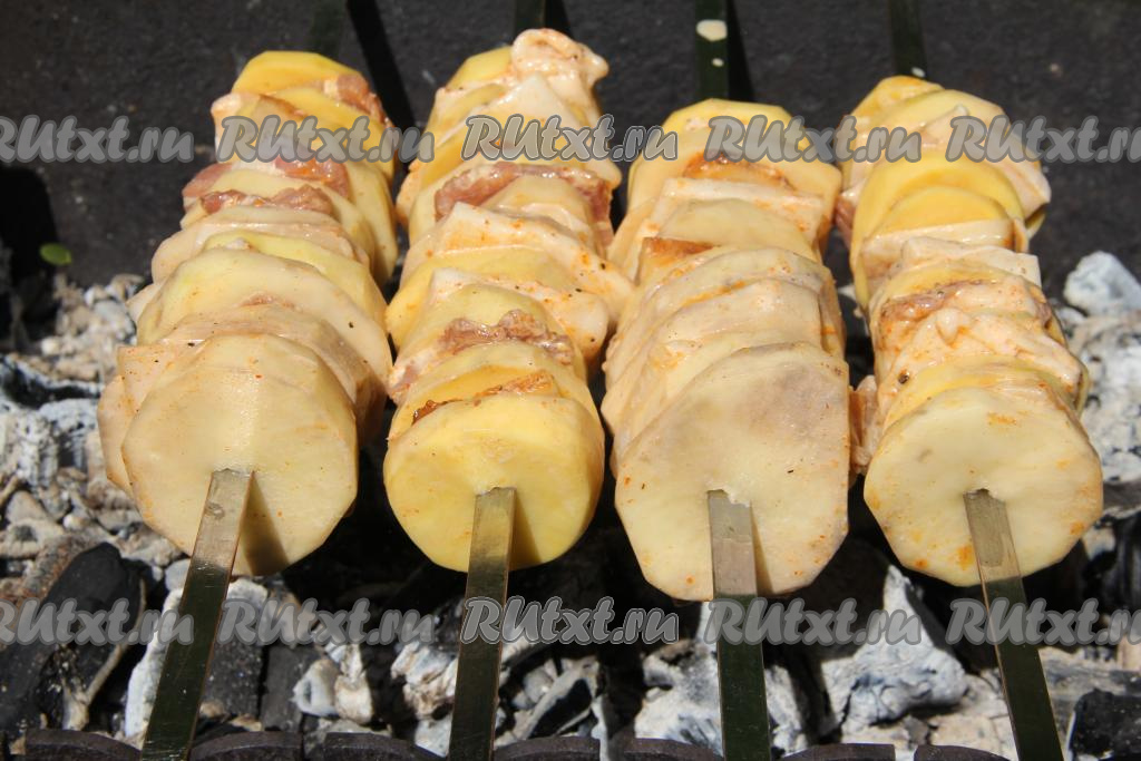 По прошествии часа сформировать шашлык на шампуре, чередуя картошку с салом. Картошку с салом нужно размещать плотно друг к другу.