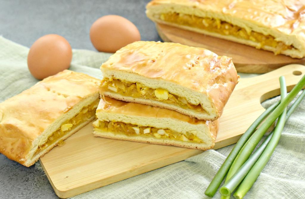 Готовый пирог с капустой и яйцами достаём из духовки, даём немного остыть, нарезаем на части и подаём вкусную, аппетитную выпечку из слоёного дрожжевого теста к столу.
