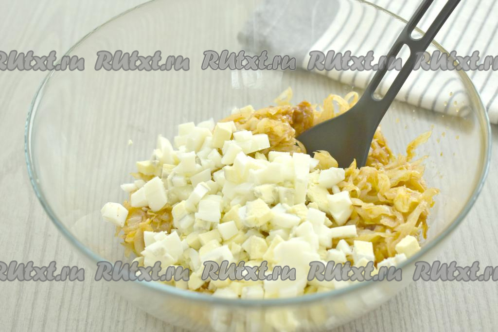 Пока капуста остывает, достаём слоёное дрожжевое тесто и даём ему разморозиться при комнатной температуре. Сразу же отвариваем 2 яйца (варим с момента закипания воды 10 минут), после этого даём остыть, очищаем, нарезаем на небольшие кубики. Остывшую капусту перекладываем в миску, добавляем нарезанные яйца, перемешиваем, пробуем на вкус, если нужно, подсаливаем.