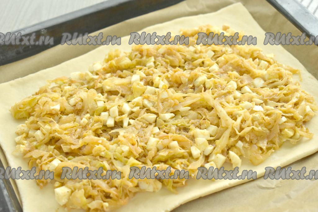 После того как тесто разморозится, можно приступать к формированию пирога. У меня слоёное дрожжевое тесто было в 2 пластах. На стол, присыпанный мукой, выкладываем первый пласт слоёного теста и немного его раскатываем (до толщины примерно 3 миллиметра). Раскатанное тесто аккуратно перекладываем на противень, застеленный пергаментом. На тесто, отступив от краёв по 2 сантиметра, равномерно выкладываем начинку из капусты и варёных яиц.