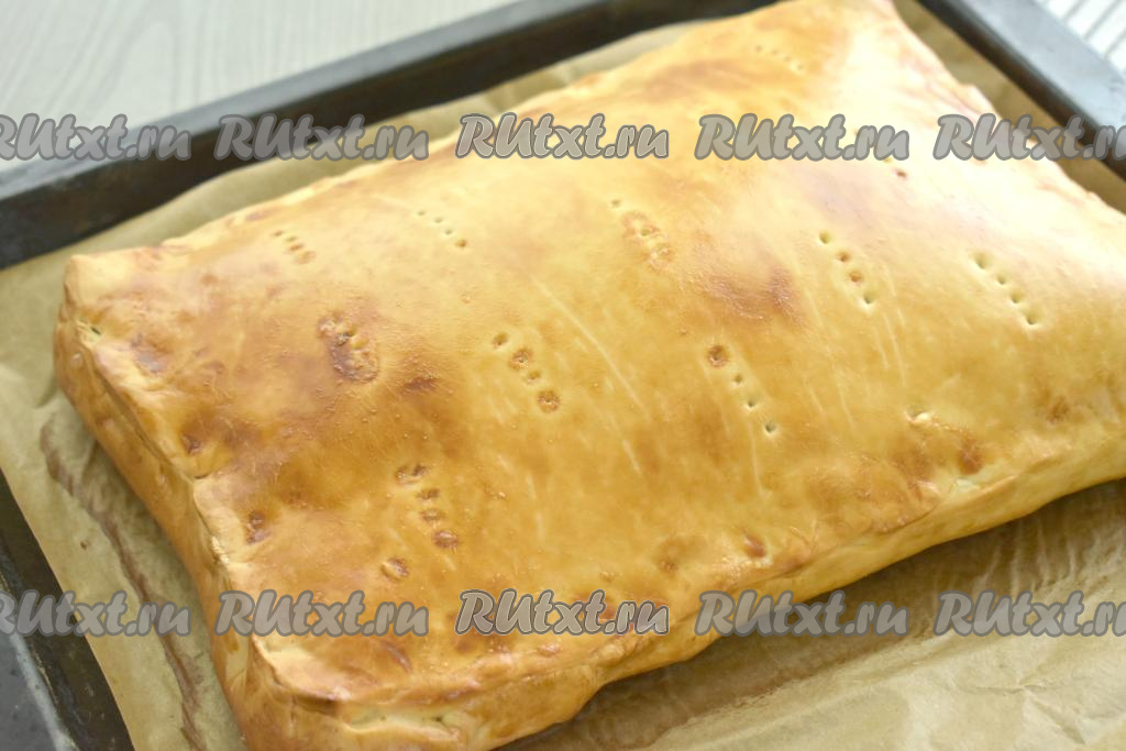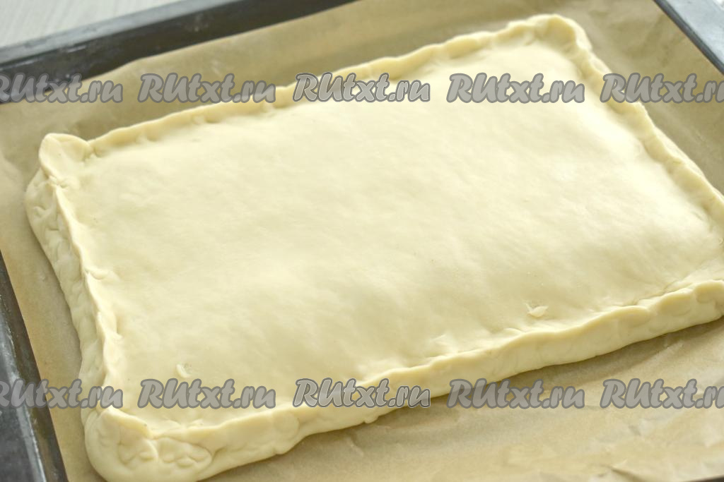 Второй пласт размороженного теста тоже раскатываем до толщины примерно 3 миллиметра, накрываем им тесто с начинкой, плотно скрепляем края, формируя пирог.