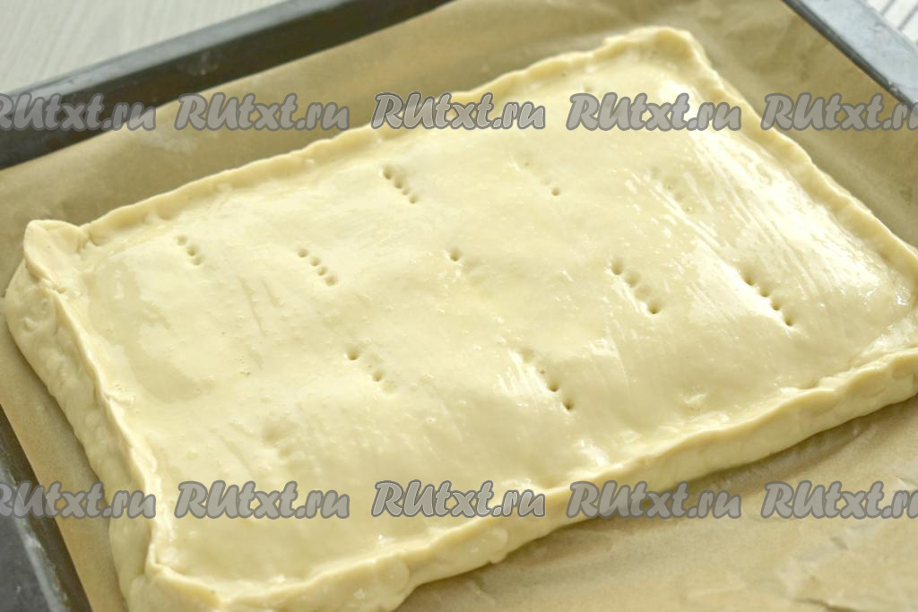На поверхности пирога делаем вилкой проколы (проколы нужны для того, чтобы выходил пар в процессе выпечки). Оставляем пирог из слоёного дрожжевого теста для расстойки минут на 20. По прошествии этого времени в небольшой ёмкости сырое яйцо взбалтываем вилкой до однородности, получившейся яичной смесью смазываем поверхность пирога.
