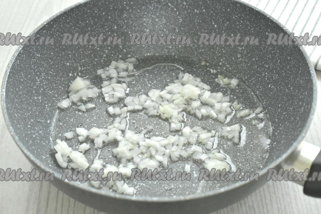 На сковороде прогреваем растительное масло, затем выкладываем мелко нарезанную очищенную луковицу. Обжариваем лук до мягкости (минут 3), иногда помешивая, на среднем огне.