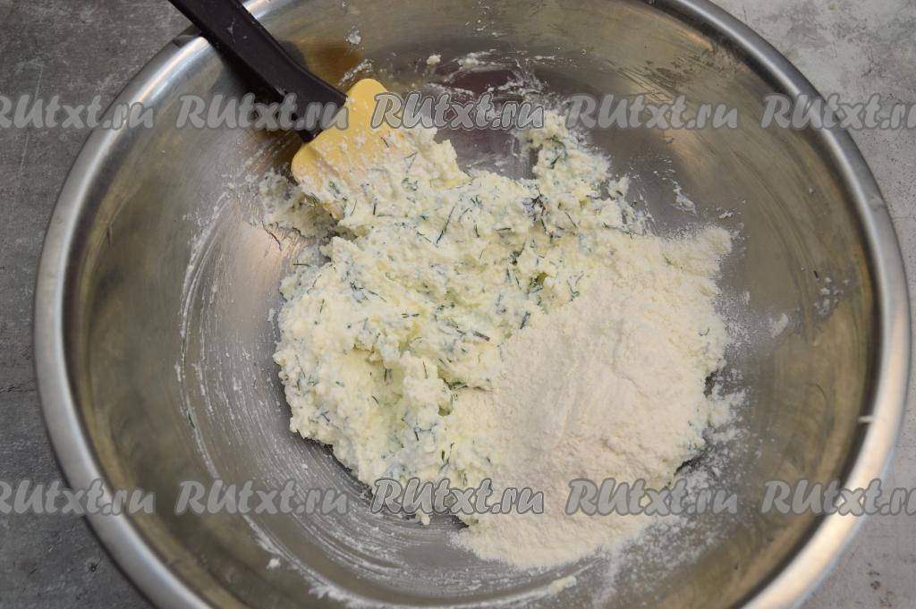 Перемешать творожную массу лопаткой (или вилкой) до однородности. Частями начать всыпать муку, тщательно вмешивая её.