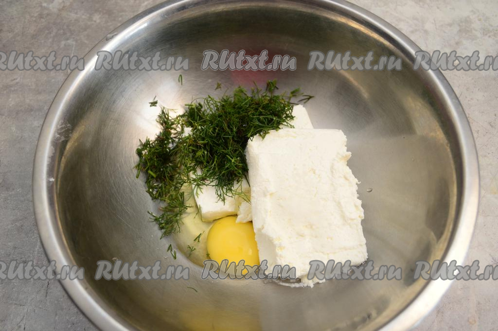 Мелко нарезать укроп и добавить в миску с творогом и яйцом.
