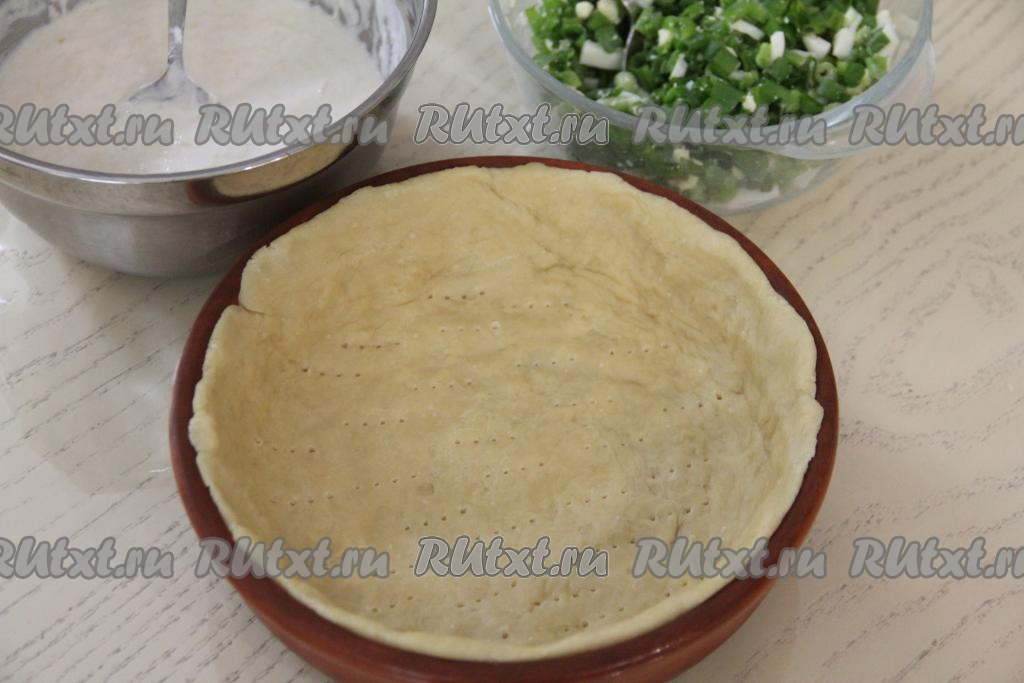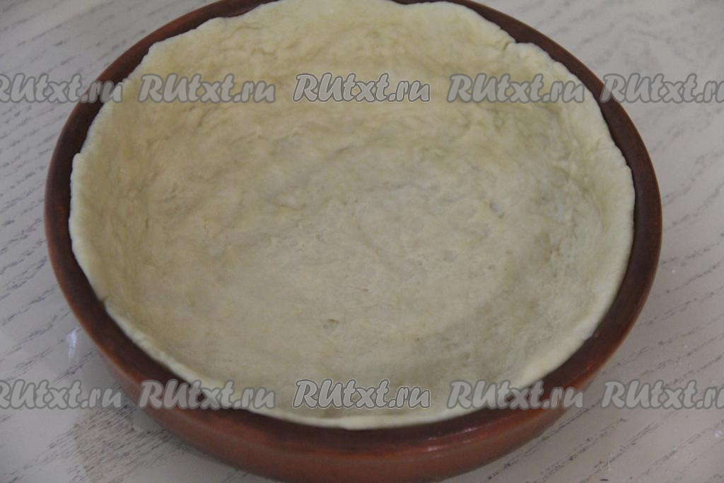 Выложить тесто в форму (я выпекала в керамической форме диаметром 20 сантиметров) и, распределив тесто по дну формы, сформировать бортик.