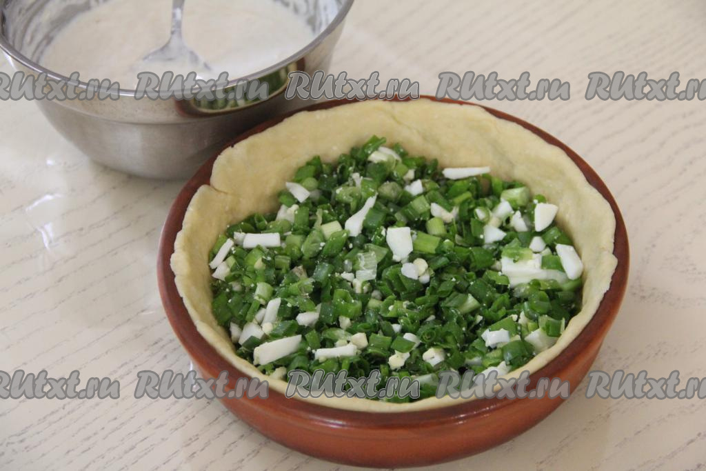 Выпекать киш с зелёным луком и яйцом в разогретой духовке минут 40 при температуре 180 градусов.