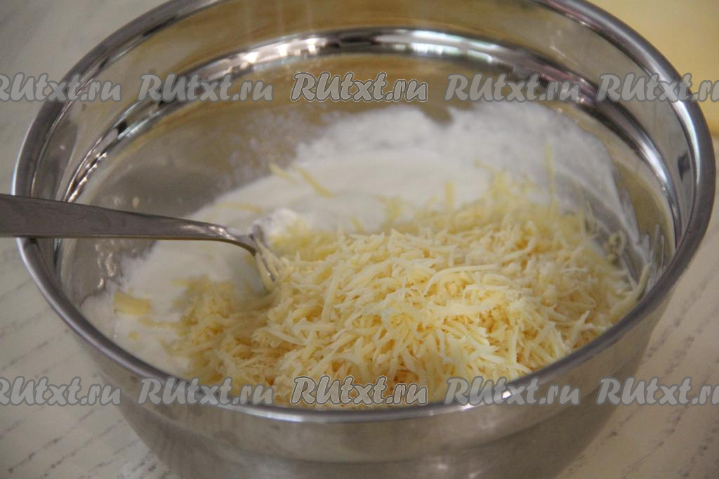 Сыр, натёртый на мелкой тёрке, выложить в сметанную заливку, перемешать.