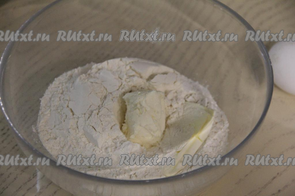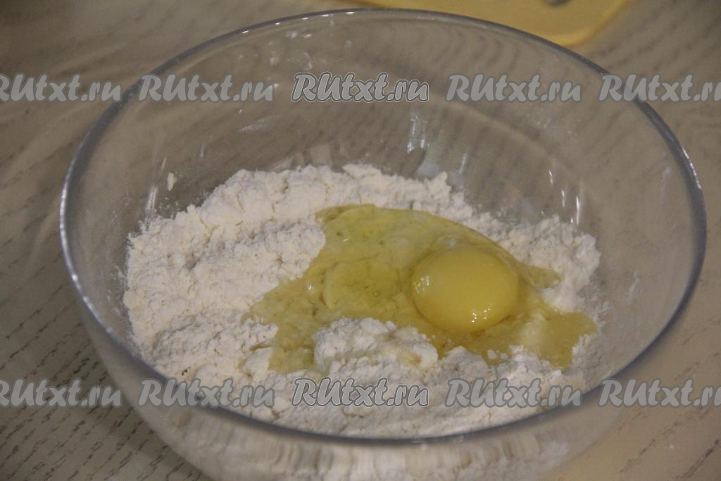 Перетереть содержимое миски руками до получения мелкой, однородной крошки. К получившейся песочной крошке вбить яйцо, перемешать, после этого начать понемногу вливать холодную воду, замешивая руками пластичное, не липнущее к ладоням песочное тесто.