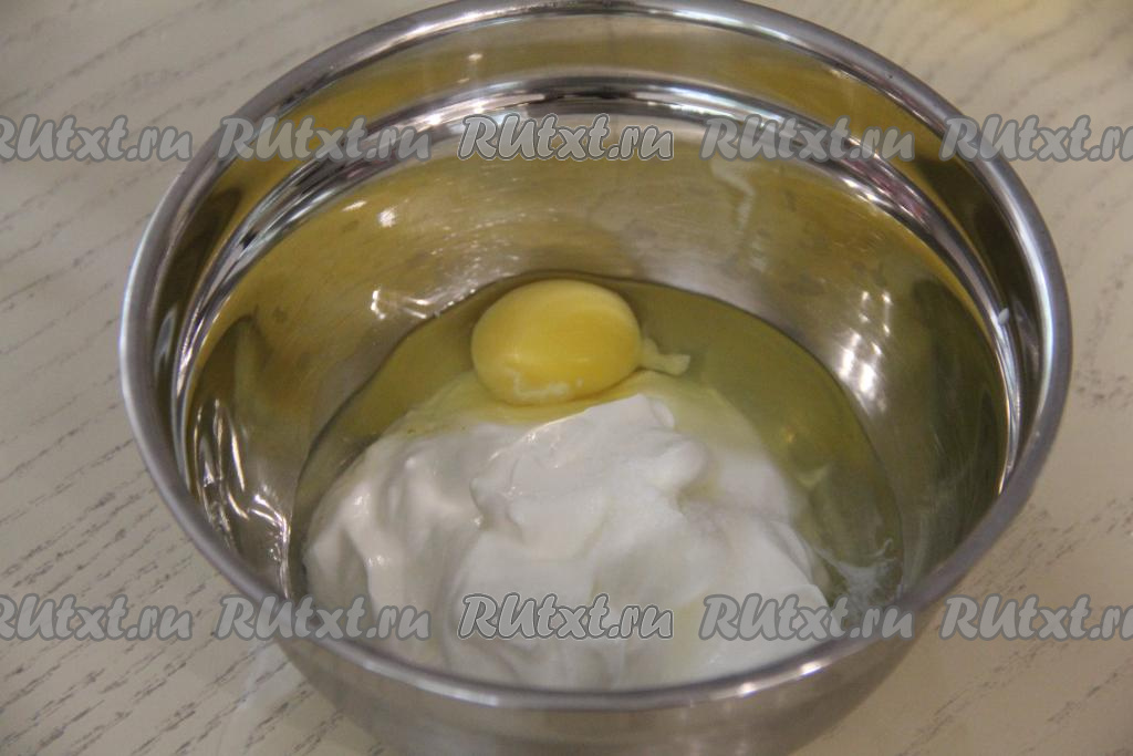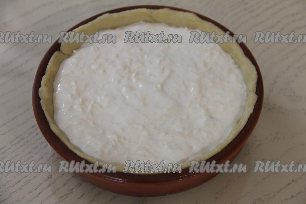 Для приготовления заливки нужно в отдельной ёмкости соединить сметану и яйцо, посолить, перемешать сметанную заливку.