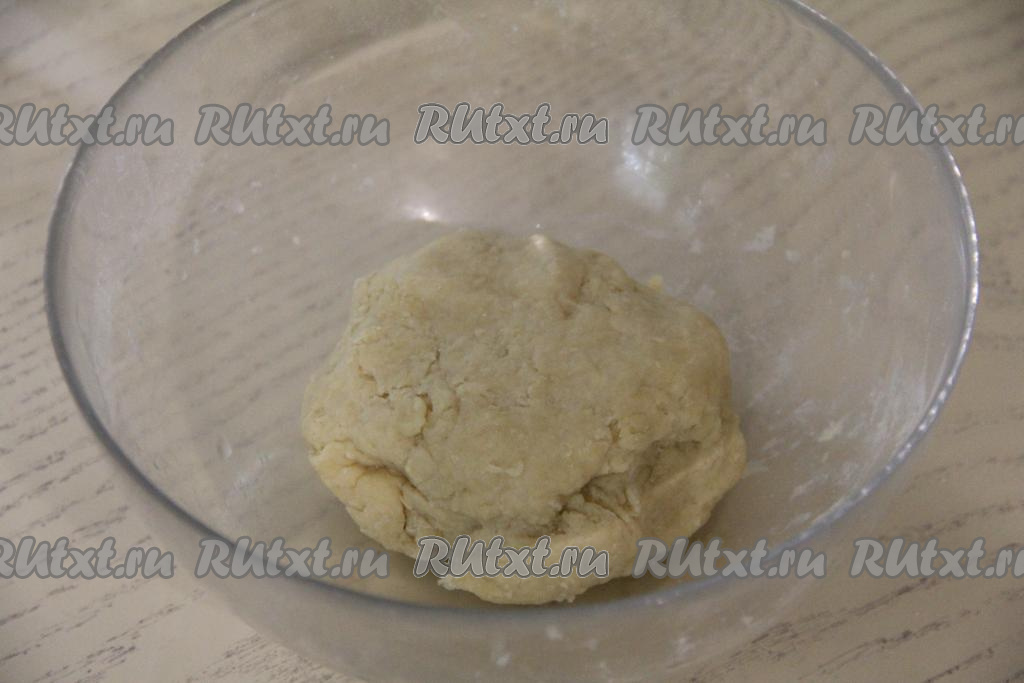 Как только песочное тесто соберётся в ком, значит больше воду добавлять не нужно. Поместить тесто в целлофановый пакет и убрать минут на 30 в холодильник.