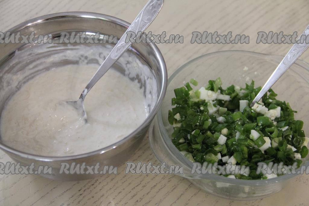 Для получения начинки зелёный лук и варёное яйцо мелко нарезать.