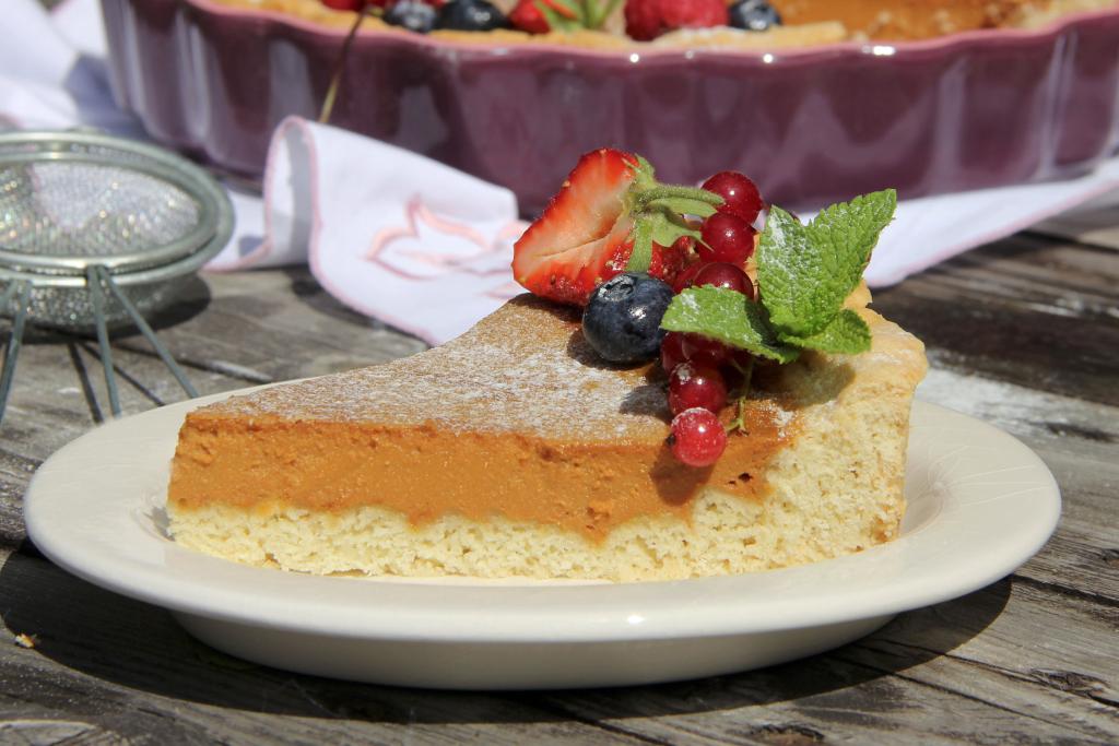 Начинка в процессе остывания не оседает, получается, как мусс. В меру сладкий, нежный, красивый песочный пирог с варёной сгущёнкой станет приятным дополнением к любому чаепитию!