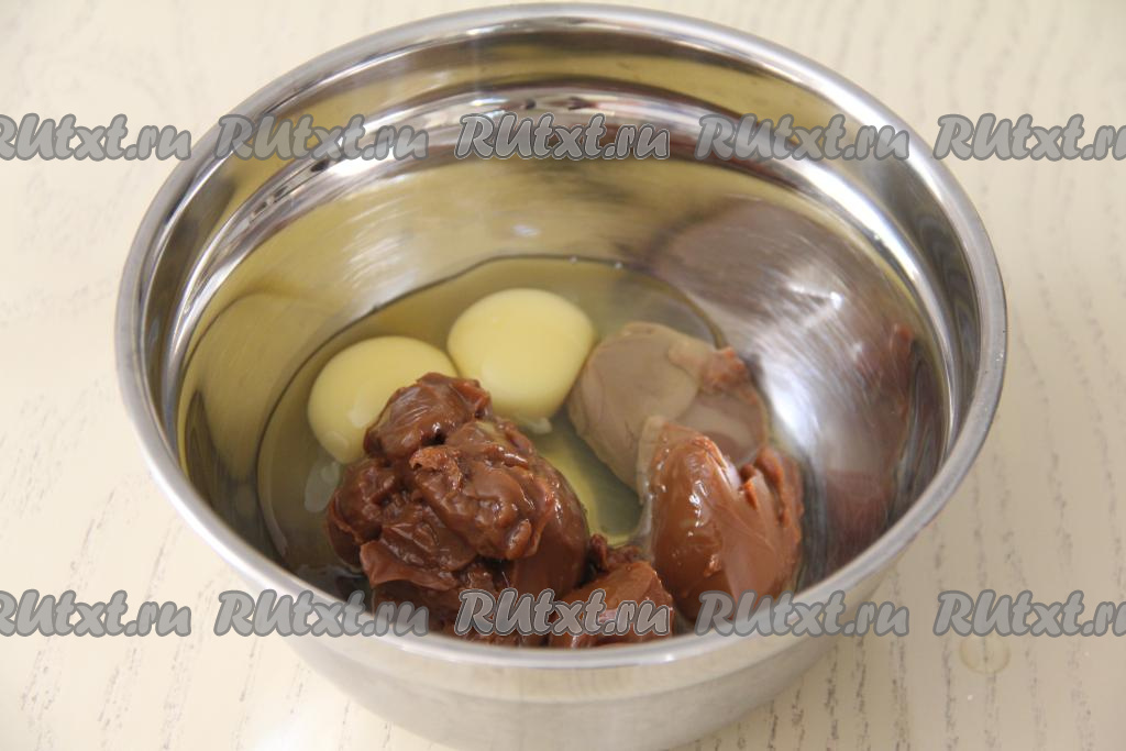 Для получения начинки в достаточно глубокой миске соединить яйца и варёную сгущёнку, перемешать.