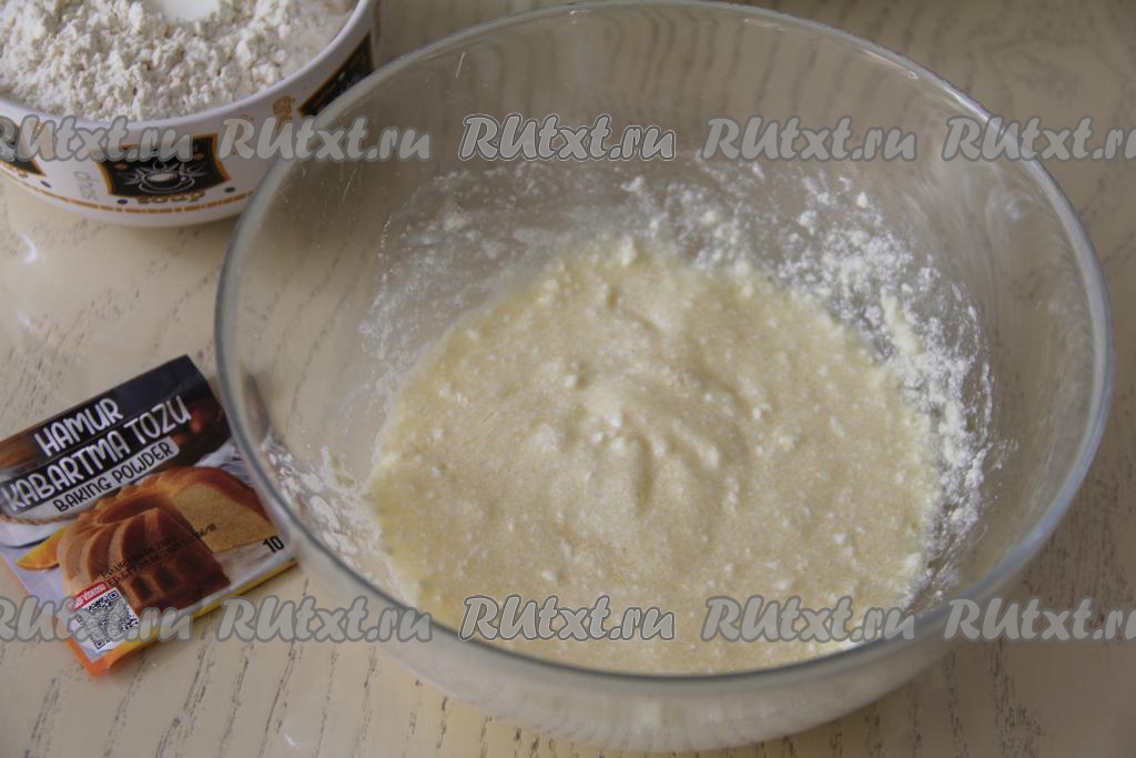 В получившуюся масляно-яичную смесь всыпать разрыхлитель и половину просеянной муки, перемешать.