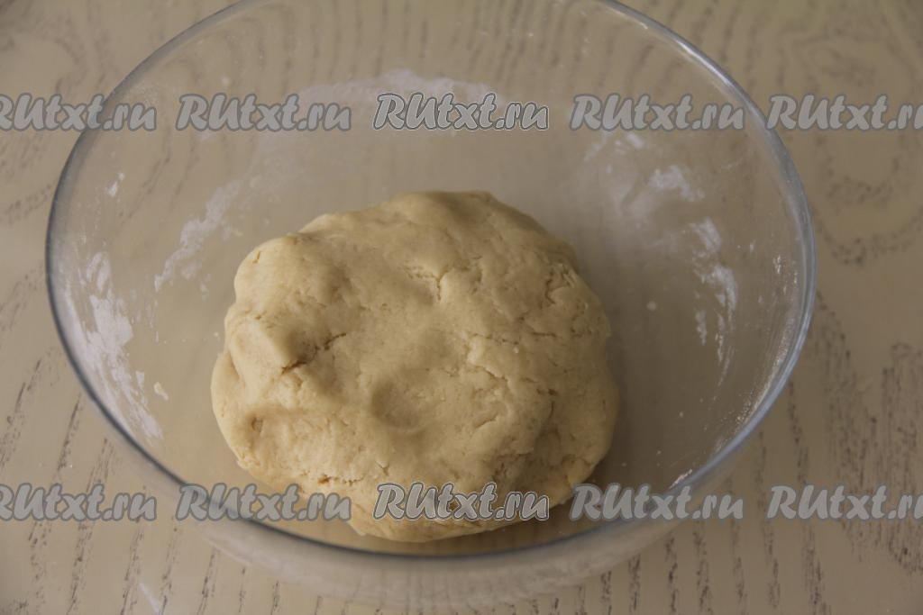 Понемногу всыпая оставшуюся просеянную муку, замесить мягкое, пластичное песочное тесто. Вымешивать это тесто не нужно, достаточно будет собрать его в ком. Завернуть тесто в пакет и убрать минут на 30 в холодильник.