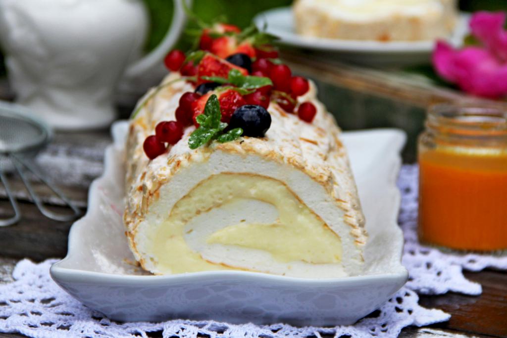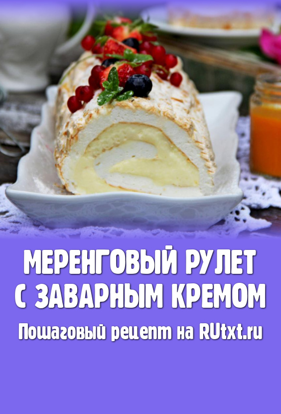 К домашнему чаепитию или на праздничный стол можно приготовить нежный меренговый рулет с заварным кремом. Украсить такой домашний десерт можно ягодами, шоколадом или сахарной пудрой. Рулет из безе получается в меру сладким, воздушным и очень вкусным, всем советую попробовать!