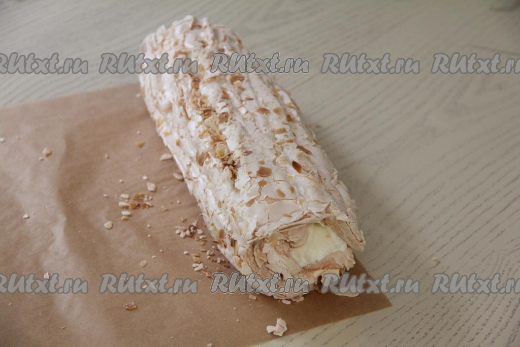 А вот каким получился в разрезе меренговый рулет с заварным кремом. Он очень нежный, вкусный, буквально тающий во рту.