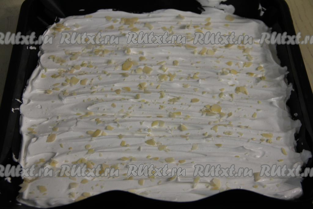 По желанию можно посыпать меренговый корж лепестками миндаля. Выпекать меренгу в разогретой до 180 градусов духовке 20 минут.
