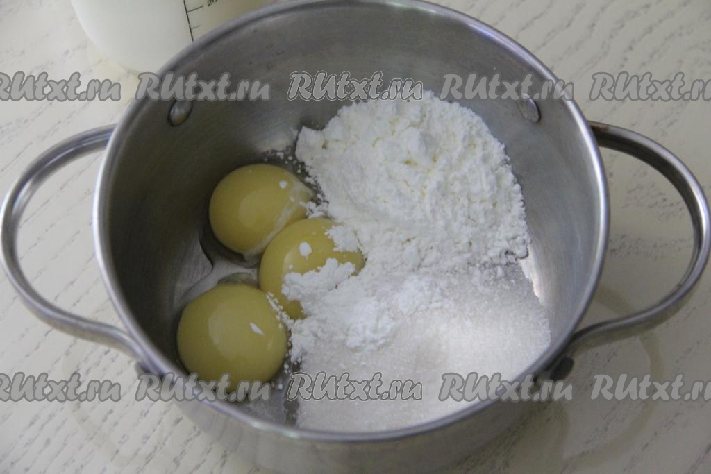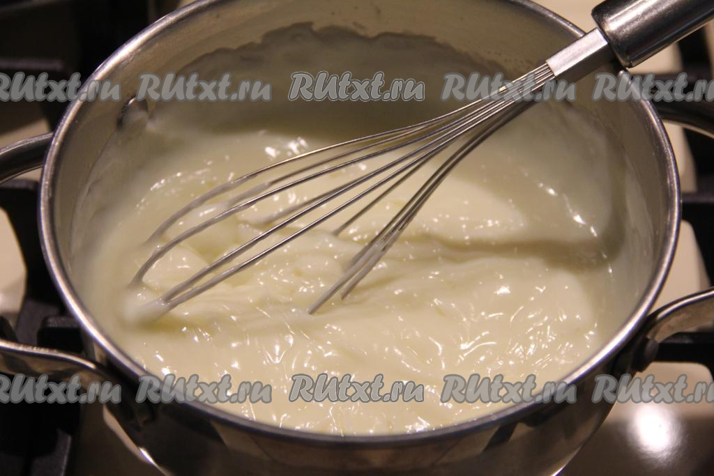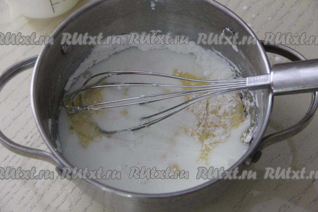 Перемешать содержимое кастрюльки венчиком, влить молоко и ещё раз перемешать до однородности. Поставить кастрюлю на средний огонь и, не переставая помешивать, довести молочно-желтковую смесь до кипения, сразу немного уменьшить огонь.