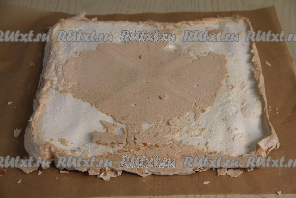 Полностью остудить корж на коврике (или на пергаменте), на котором он выпекался. Затем перевернуть меренговый корж на новый лист пергамента и аккуратно снять пергамент, на котором выпекался корж.