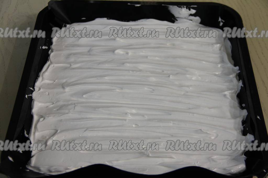 Противень (у меня противень размером 45 сантиметров на 30 сантиметров) застелить ковриком (или пергаментом) для выпечки, затем выложить белковую массу и равномерно распределить по всему противню.
