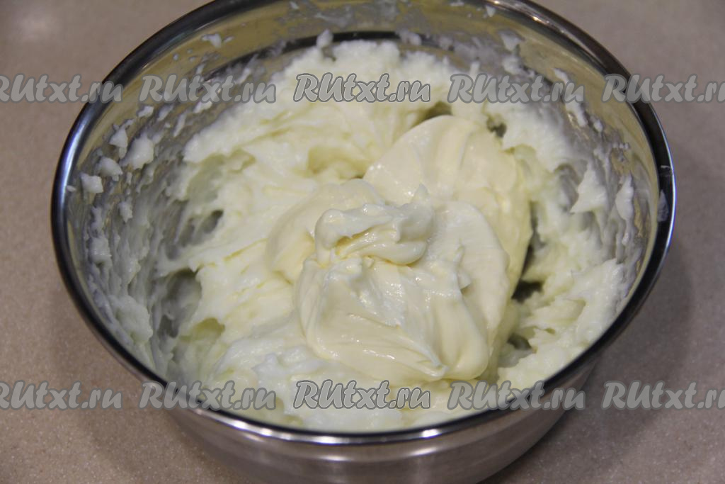 В миску с остывшим кремом добавить сливочное масло комнатной температуры, взбить заварной крем миксером. Крем получится нежным, прикрыть его крышкой (или затянуть миску плёнкой) и убрать в холодильник на время, пока будем готовить меренговый корж.