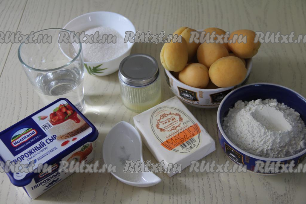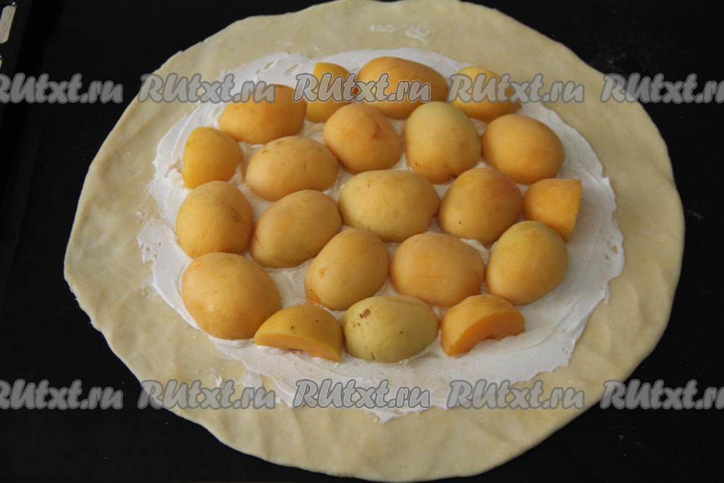 Абрикосы разрезать на 2 части, удалить косточки. Абрикосы срезом вниз выложить на тесто, смазанное творожным сыром.