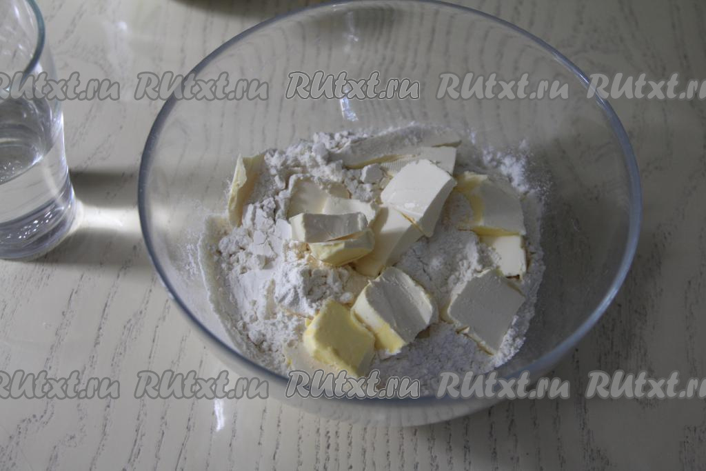 Для замешивания теста нужно просеять в миску муку, всыпать соль и сахар, добавить холодное сливочное масло, нарезанное на небольшие кусочки.