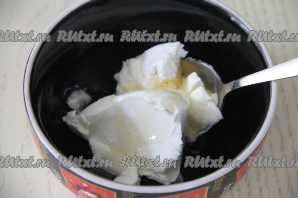В отдельной ёмкости соединить творожный сыр с мёдом (или сахаром) и тщательно перемешать.