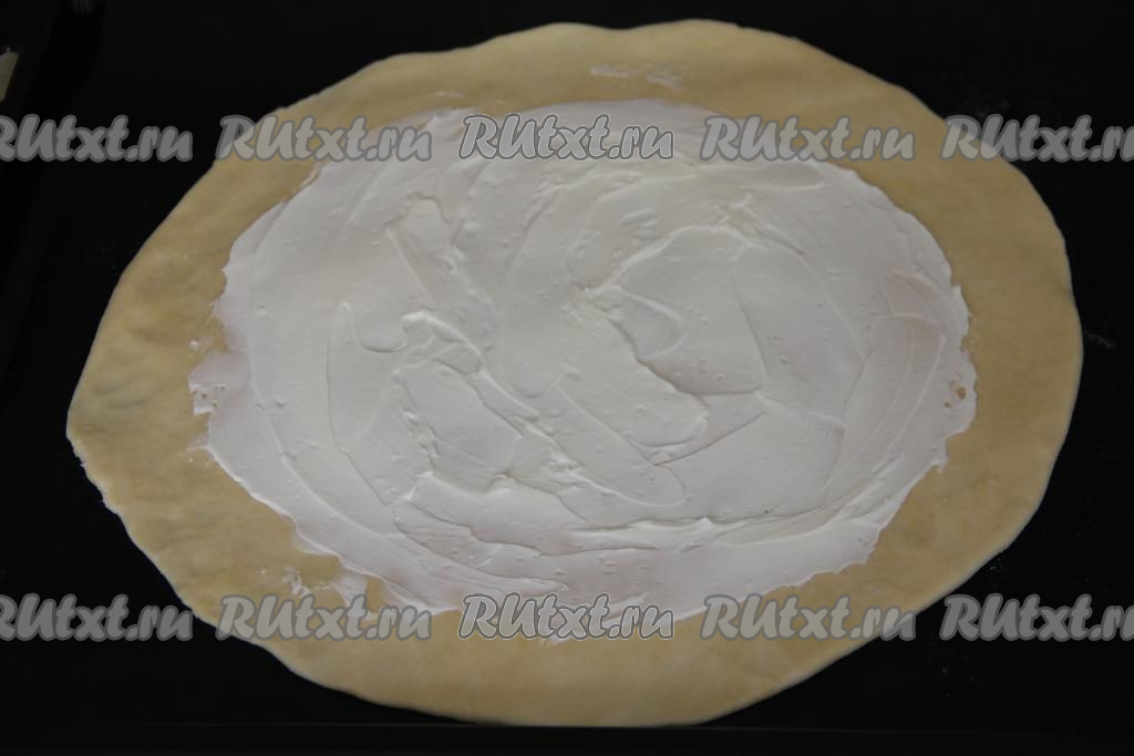 Центр раскатанного теста, отступая от краёв примерно по 5 сантиметров, равномерно смазать творожным сыром, смешанным с мёдом (или сахаром).