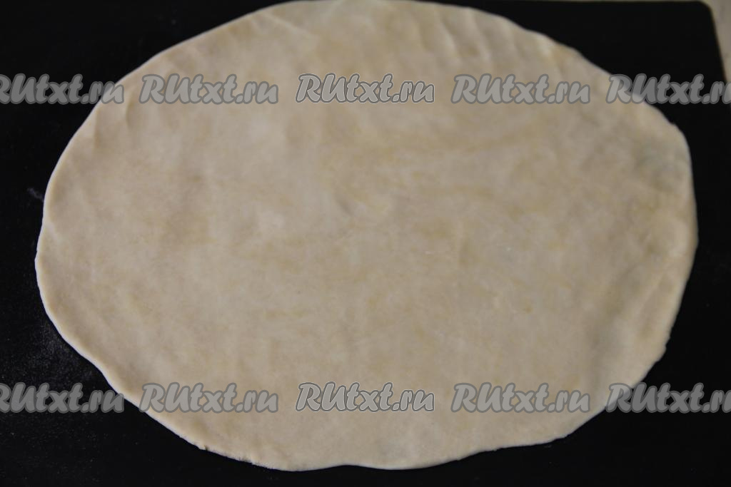 На коврике (или бумаге) для выпечки охладившееся тесто раскатать в круг диаметром примерно 30 сантиметров.