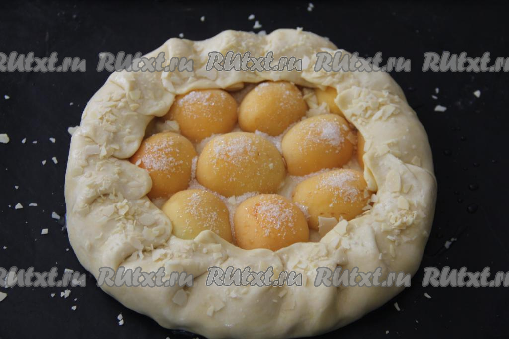 Присыпать абрикосы 2 столовыми ложками сахара. Завернуть тесто по краю и хорошо защипать, формируя открытый пирог, как на фото. Слегка смазать тесто водой и, по желанию, присыпать сахаром или лепестками миндаля.