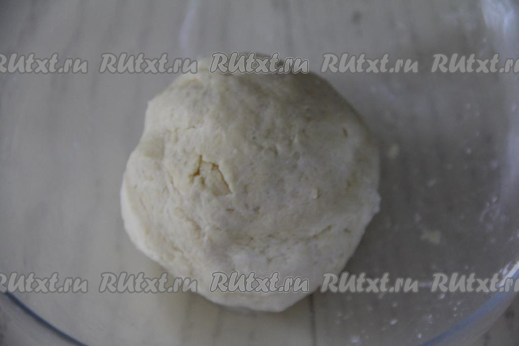 Постепенно вливая воду, собрать тесто в пластичный, мягкий, не липнущий к ладоням ком. Как только тесто соберётся в ком, значит больше не надо вливать воду. Вымешивать песочное тесто не нужно, достаточно, чтобы оно просто собралось в ком. Поместить тесто в пакет и минут на 30 убрать его в холодильник.