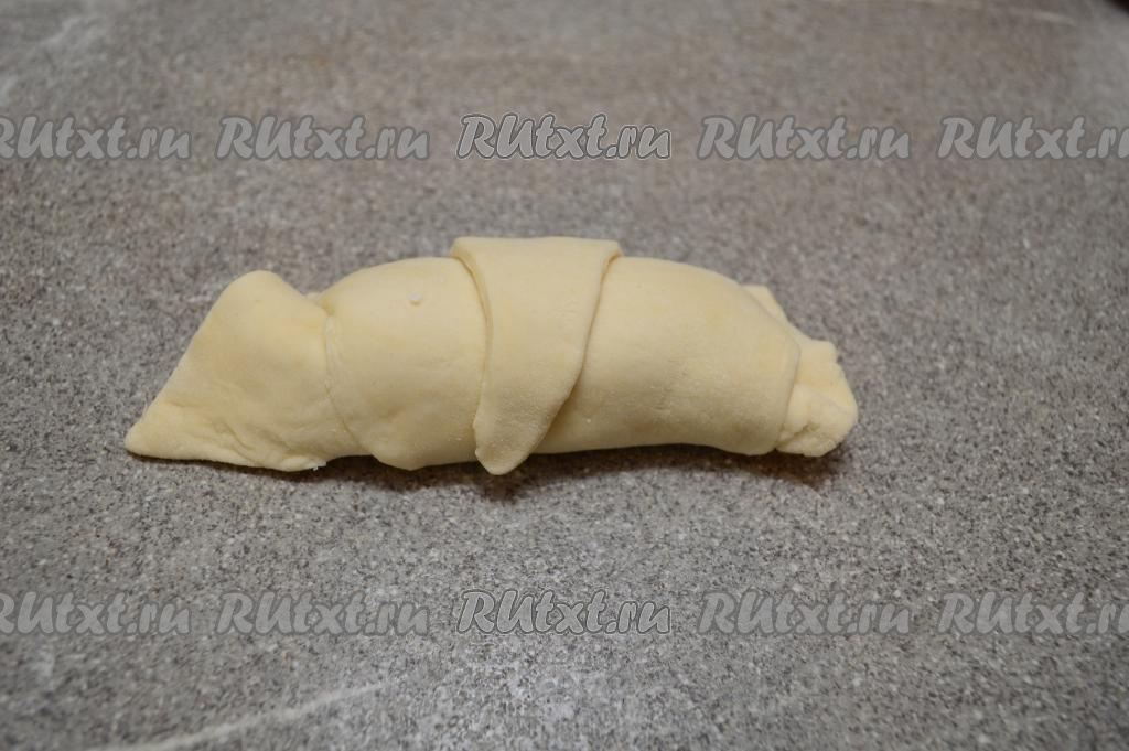 Завернуть основание треугольника на начинку, полностью закрывая творог, прижать пальцами тесто вокруг начинки (это делается для того, чтобы творог не вытекал в процессе выпечки и круассан хорошо держал форму).