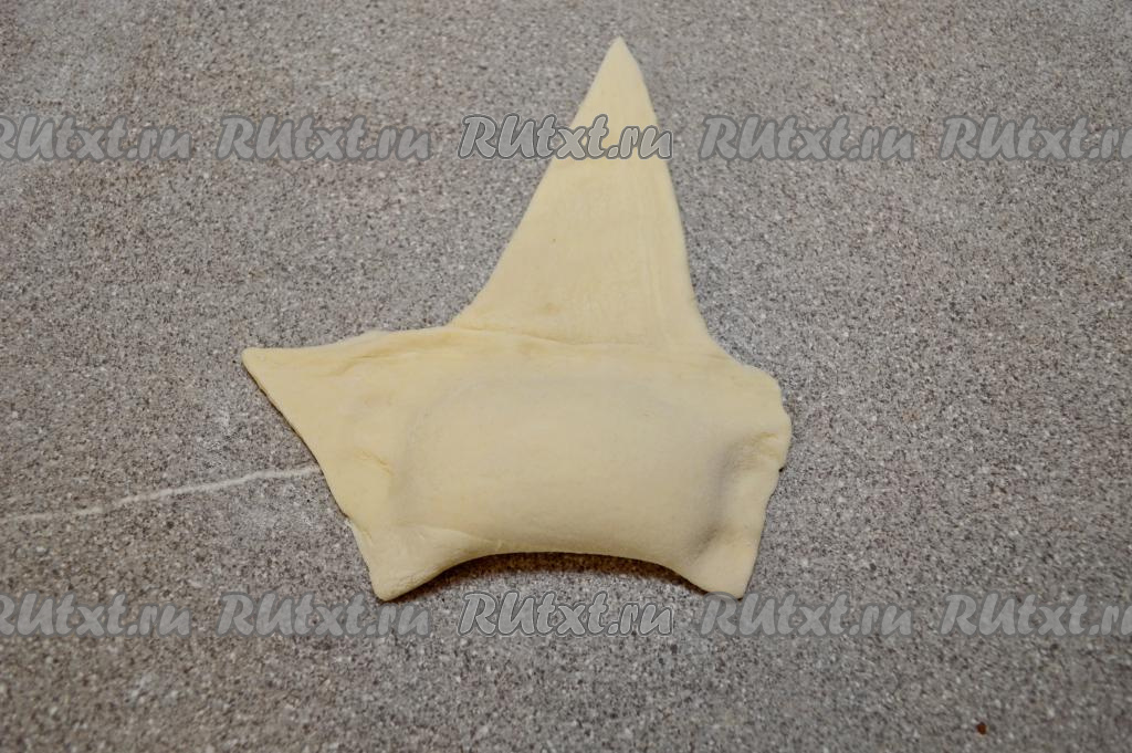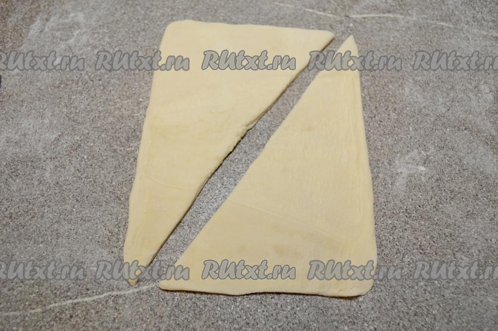 Разрезать прямоугольник по диагонали, получатся 2 треугольные заготовки. Аналогично сделать ещё две треугольные заготовки из второй части теста.