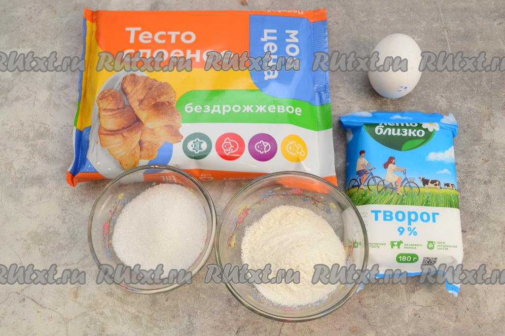 Подготовить продукты. Для приготовления круассанов с творогом отлично подойдёт как дрожжевое, так и бездрожжевое слоёное тесто. Я взяла бездрожжевое. Разморозить слоёное тесто при комнатной температуре.