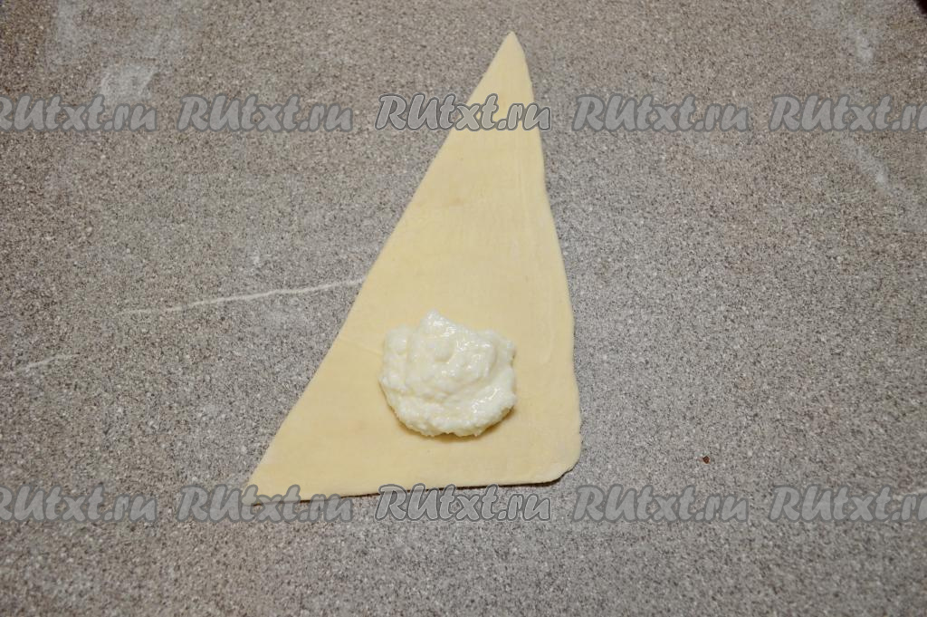 Ближе к основанию треугольной заготовки, отступая от краёв ориентировочно по 1,5 сантиметра, выложить 1,5-2 чайных ложки творожной начинки.