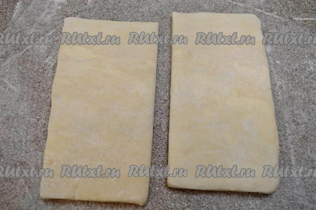 Для формирования круассанов я взяла пласт слоёного теста весом 250 грамм. Разрезать пласт на 2 равные части.