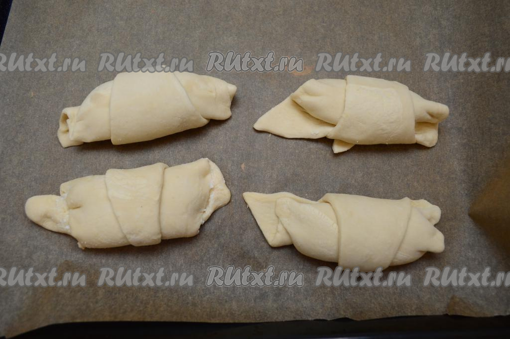 Также сформировать ещё 3 заготовки круассанов с творогом. На противень, застеленный пергаментом, выложить все 4 заготовки круассанов на небольшом расстоянии друг от друга.