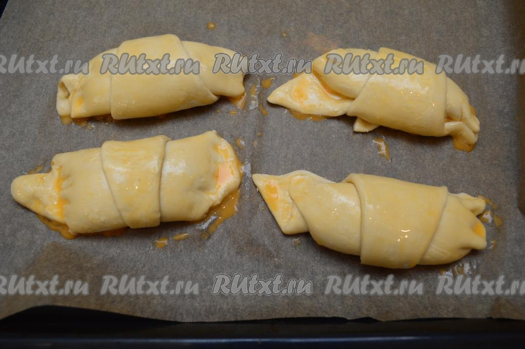 Яйцо в небольшой ёмкости слегка взбить вилкой. Смазать каждый круассан взбитым яйцом. Круассаны с творогом отправить выпекаться в разогретую до 200 градусов духовку.