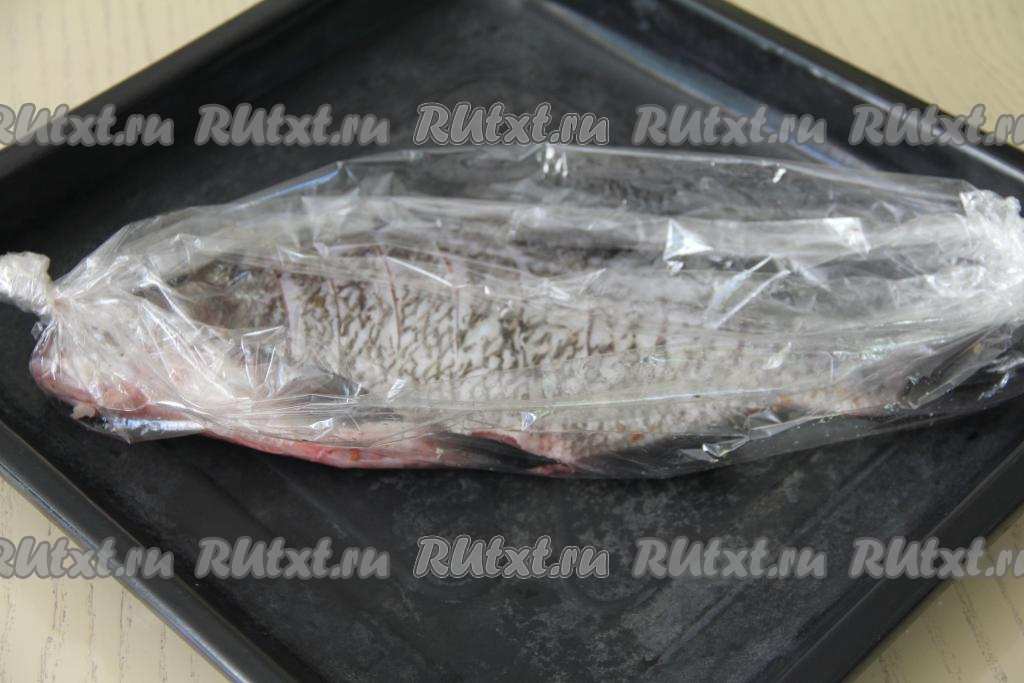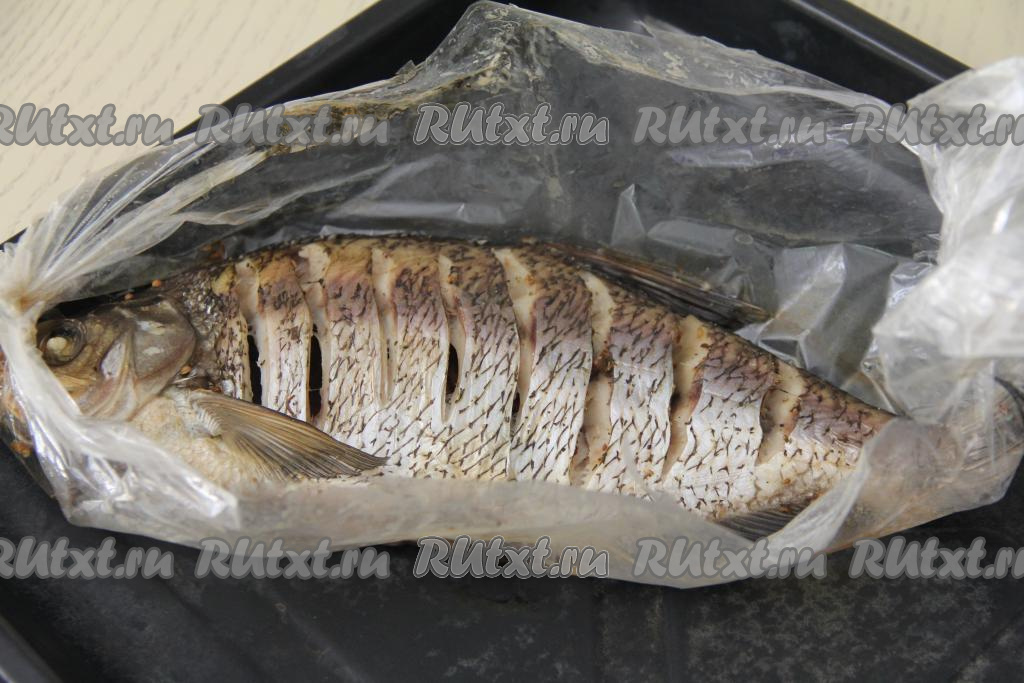Натереть рыбку солью и специями для рыбы внутри и снаружи. Поместить подготовленного леща в рукав для запекания. Завязать рукав с двух сторон. На поверхности рукава с помощью зубочистки сделать несколько проколов для выхода пара.
