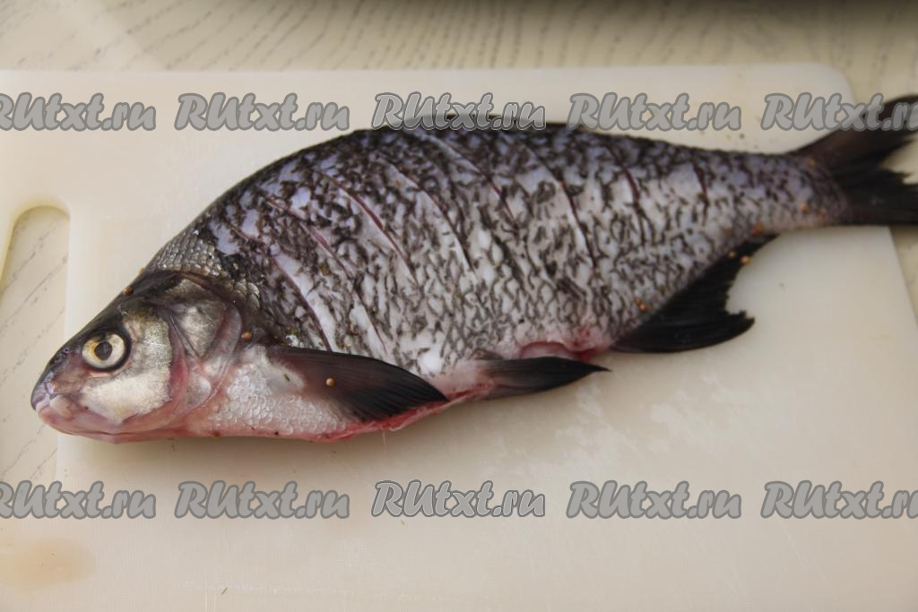 Леща почистить от чешуи. Удалить внутренности, промыть рыбу под проточной водой, затем немного обсушить. Сделать надрезы острым ножом с двух сторон по всей поверхности леща.